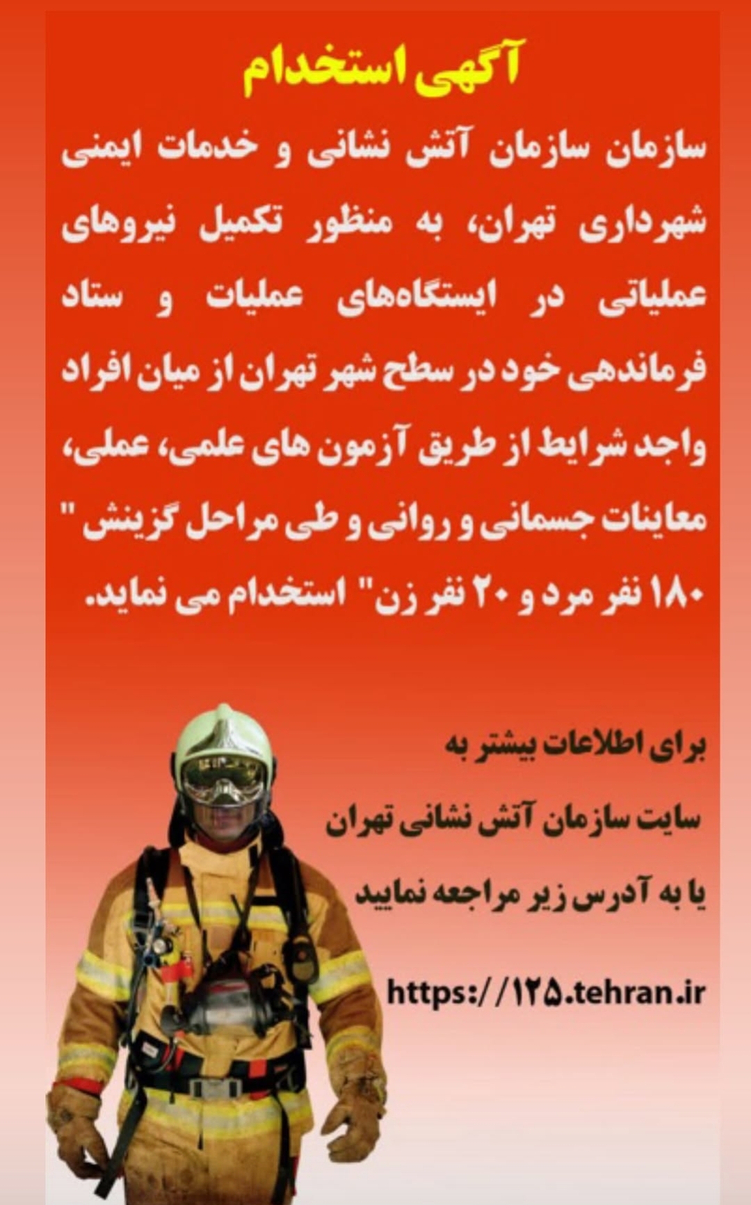 سازمان سازمان آتش نشانی و خدمات ایمنی شهرداری تهران به منظور تکمیل نیروهای عملیاتی در ایستگاههای عملیات و ستاد فرماندهی خود در سطح شهر تهران از میان افراد واجد شرایط از طریق آزمون های علمی عملی معاینات جسمانی و روانی و طی مراحل گزینش ۱۱ ۱۸۰ نفر مرد و ۲۰ نفر زن استخدام می نماید