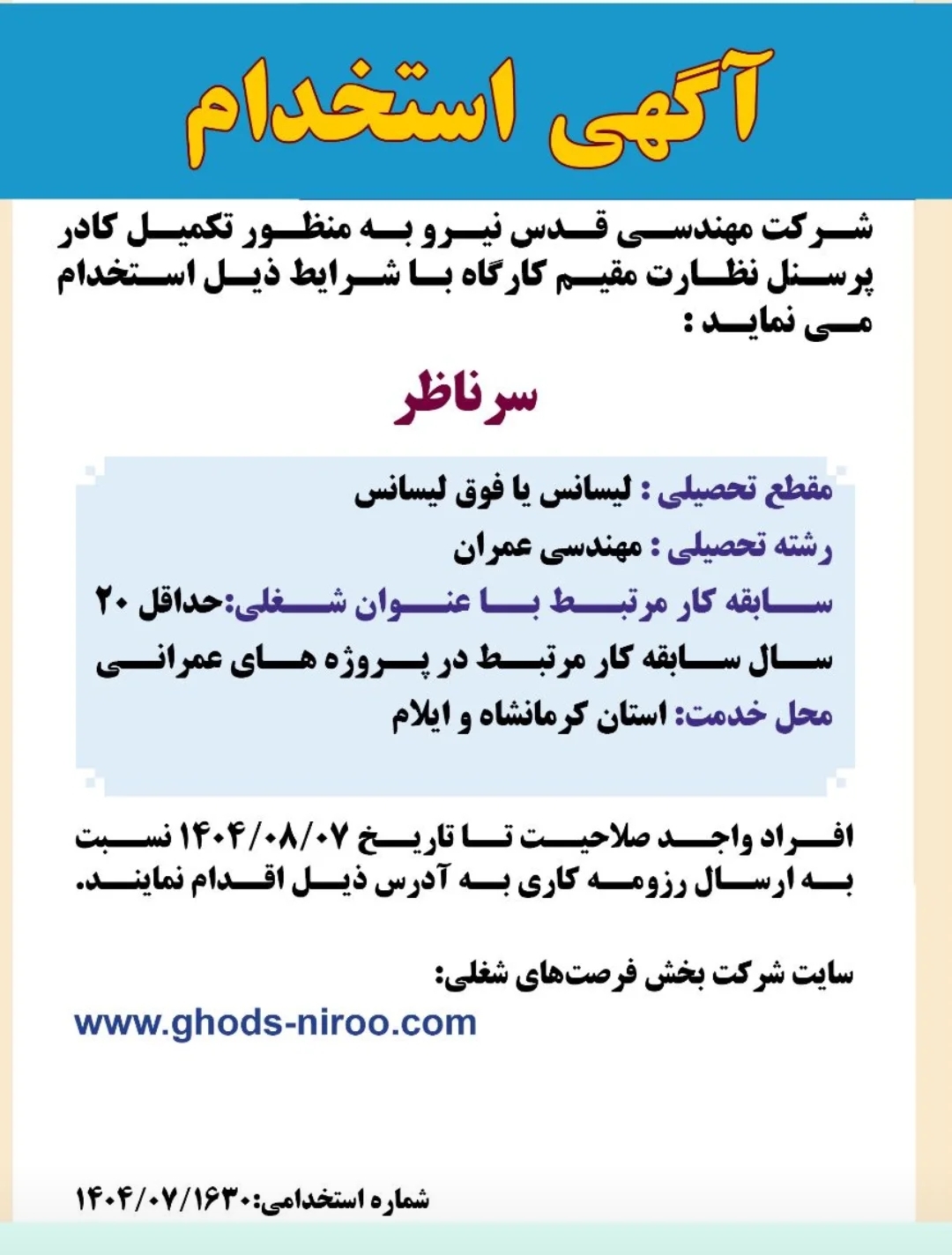 آوای جنوب شرکت مهندسی قدس نیرو به منظور تکمیل کادر پرسنل نظارت مقیم کارگاه با شرایط ذیل استخدام می نماید : سرناظر مقطع تحصیلی : لیسانس یا فوق لیسانس رشته تحصیلی : مهندسی عمران سابقه کار مرتبط با عنوان شغلی حداقل ۲۰ سال سابقه کار مرتبط در پروژه های عمرانی محل خدمت استان کرمانشاه و
