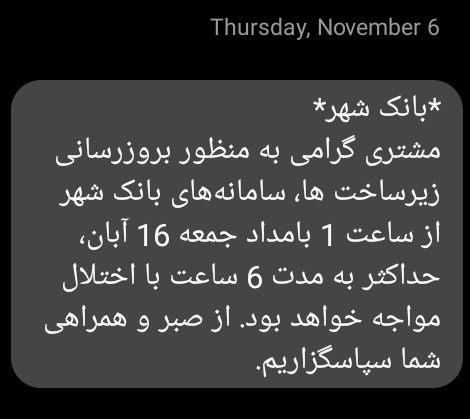 طبق پیام رسمی بانک شهر: مشتری گرامی؛ به منظور بروزرسانی زیرساخت‌ها، سامانه‌های بانک شهر از ساعت ۱ بامداد روز جمعه ۱۶ آبان، به مدت حداکثر ۶ ساعت با اختلال مواجه خواهد بود. از صبر و شکیبایی شما سپاسگزاریم.