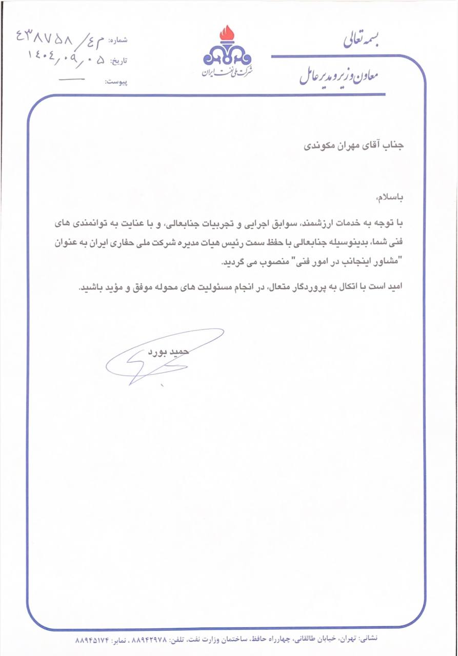 🔹با حکم حمید بورد؛ مدیرعامل شرکت ملی نفت ایران، مهران مکوندی با حفظ سمت رییس هیات مدیره شرکت ملی حفاری ایران ،بعنوان مشاور وی در امور فنی منصوب شد.