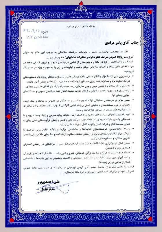 نظر به تخصص توانمندی تعهد و تجرببیات ارزشمند جنابعالی به موجب این حکم ببه عنوان سرپرس روابط عمومی شرکت خطوط لوله و مخابرات نفت ایران منصوب می شوید.