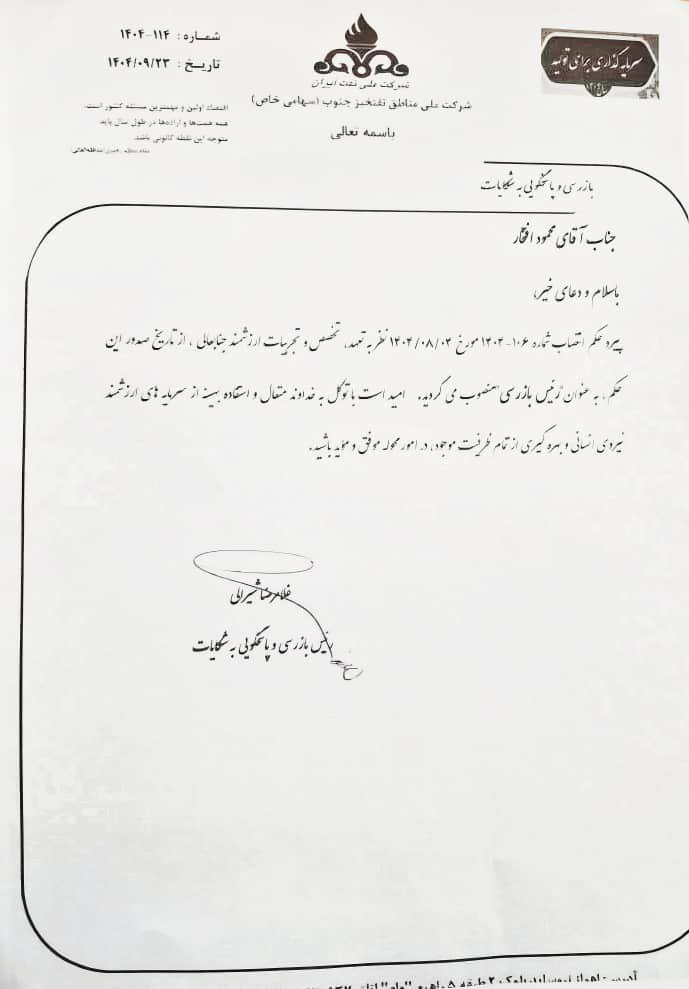 آوای جنوب، غلامرضا شیرالی، رئیس بازرسی و پاسخگویی به شکایات شرکت ملی مناطق نفتخیز جنوب طی حکمی محمود افتخار را به عنوان رئیس بازرسی این شرکت منصوب نمود.