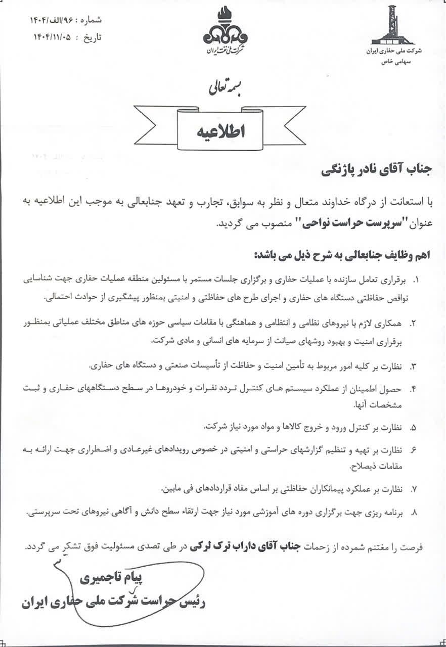 انتصاب رییس حراست نواحی شرکت ملی حفاری ایران