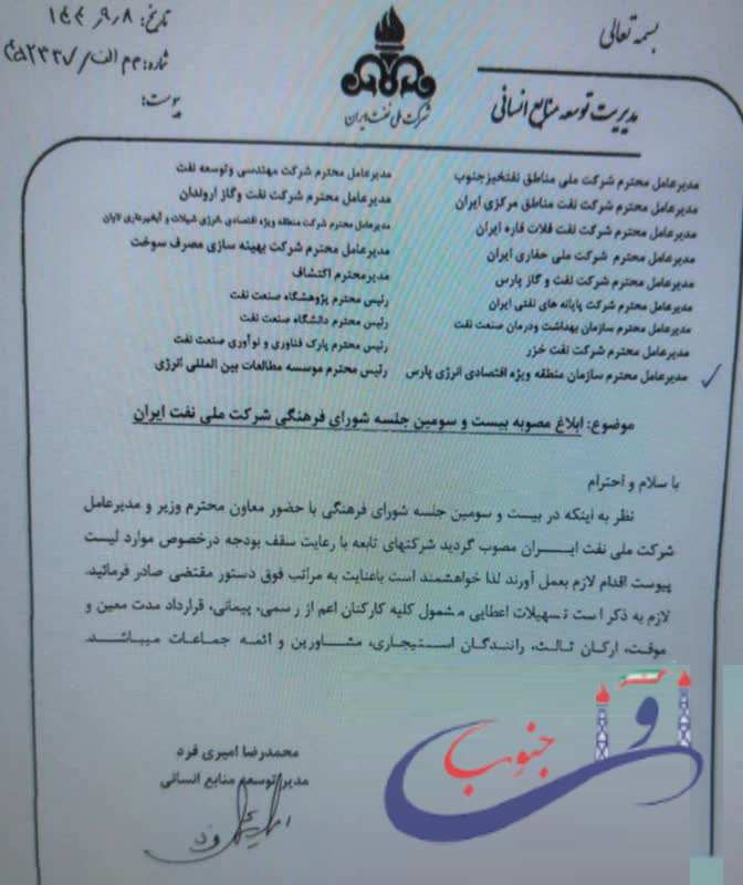 آوای جنوب، در بیستوسومین جلسه شورای فرهنگی با حضور معاون محترم وزیر و مدیرعامل شرکت ملی نفت ایران، مقرر گردید شرکتهای تابعه با رعایت سقف بودجه در خصوص موارد مندرج در لیست پیوست اقدام لازم را بهعمل آورند.