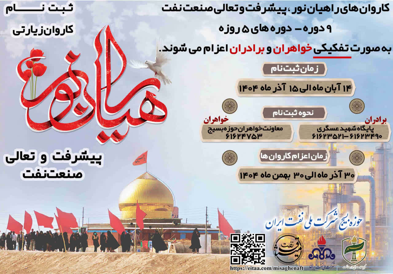 این کاروان ها در ۹ دوره ۵ روزه به صورت تفکیکی خواهران و برادران توسط حوزه بسیج شرکت ملی نفت ایران اعزام می شوند. آوای جنوب، زمان ثبتنام : ۱۴ آبان ماه الی ۱۵ آذرماه ۱۴۰۴ نحوه ثبت نام کاروان زیارتی راهیان نور پیشرفت و تعالی صنعت نفت: برادران : پایگاه شهبد عسگری ۰۲۱۶۱۶۲۳۵۲۱-۰۲۱۶۱۶۲۳۴۹۰ خواهران