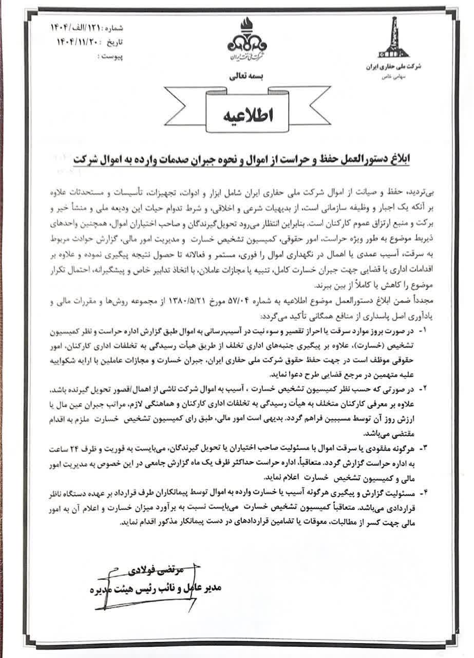 مرتضی فولادی مدیرعامل شرکت ملی حفاری ایران با صدور اطلاعیه‌ای، دستورالعمل حفظ و حراست از اموال و نحوه جبران خسارات وارده را به واحدهای ذیربط ابلاغ کرد. بر اساس این دستورالعمل، هرگونه سرقت، تخریب یا قصور در نگهداری اموال شرکت، علاوه بر پیگیری‌های اداری و تنبیه عاملان، مستلزم اقدام حقوقی و جبران کامل خسارت خواهد بود. گزارش‌دهی فوری و پیگیری مستمر خسارات در اولویت این سیاست جدید قرار دارد.