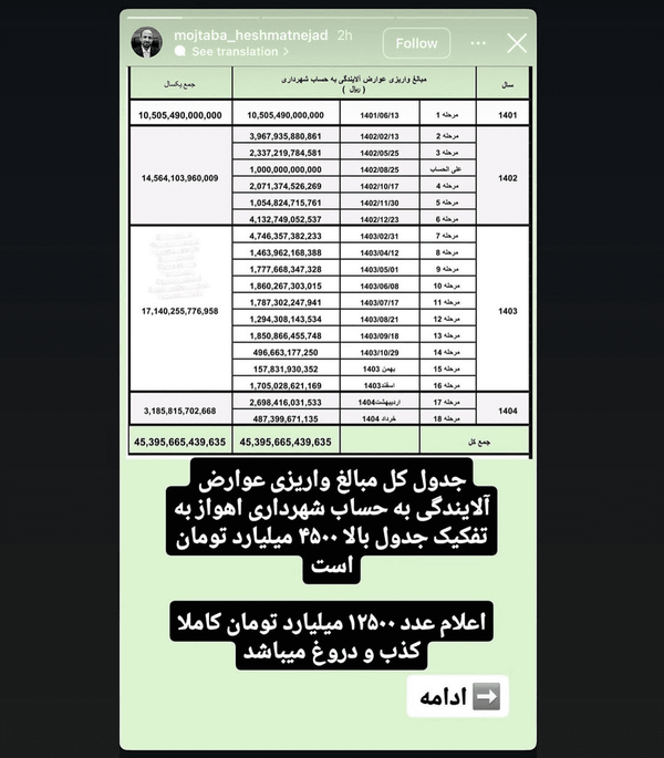 «عدد ۱۲ هزار و ۵۰۰ میلیارد تومان کاملاً کذب و دروغ است. کل مبالغ واریزی به حساب شهرداری اهواز تنها ۴ هزار و ۵۰۰ میلیارد تومان بوده است.