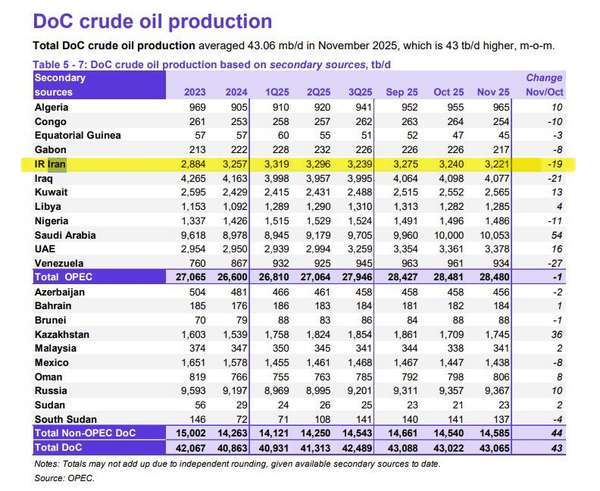 این درحالیست که آمارهای اوپک نشان میدهد که ایران در ماه نوامبر تولیدش ۱۹ هزار بشکه در روز کاهش پیدا کرده و به ۳ میلیون و ۲۲۱ هزار بشکه در روز رسیده است.