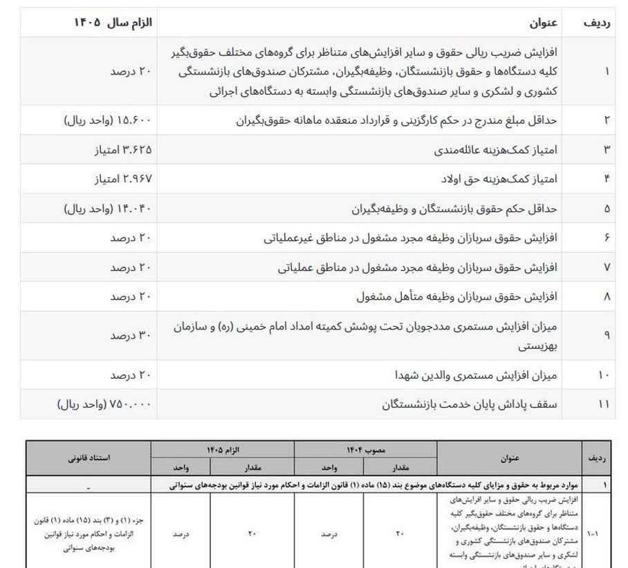 بر اساس لایحه بودجه سال ۱۴۰۵، ضریب ریالی حقوق و سایر افزایشهای متناظر برای گروههای مختلف حقوقبگیر کلیه دستگاهها و حقوق بازنشستگان، وظیفهبگیران، مشترکان صندوقهای بازنشستگی کشوری و لشکری و سایر صندوقهای بازنشستگی وابسته به دستگاههای اجرایی ۲۰ درصد تعیین شد. آوای جنوب، حداقل حقوق ماهانه کارکنان ۱۵ میلیون و ۶۰۰ هزار تومان قدیم اعلام