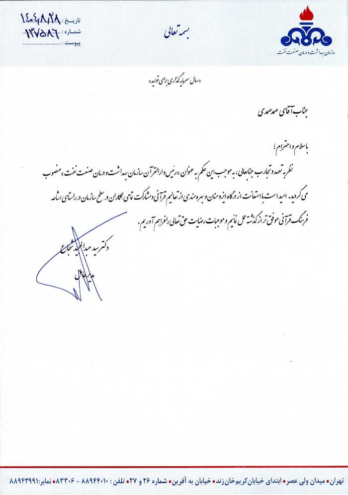 آوای جنوب، دکتر سید عبدالمجید شجاع مدیرعامل سازمان بهداشت و درمان صنعت نفت در حکمی صمدصمدی را بعنوان رئیس دارالقرآن سازمان بهداشت و درمان صنعت نفت منصوب کرد.