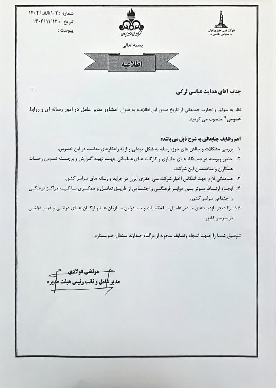 آوای جنوب، مرتضی فولادی، مدیرعامل و نایبرئیس هیئتمدیره شرکت ملی حفاری ایران، با صدور حکمی، هدایت عباسیلرکی را به سمت «مشاور مدیرعامل در امور رسانهای و روابط عمومی» منصوب کرد.