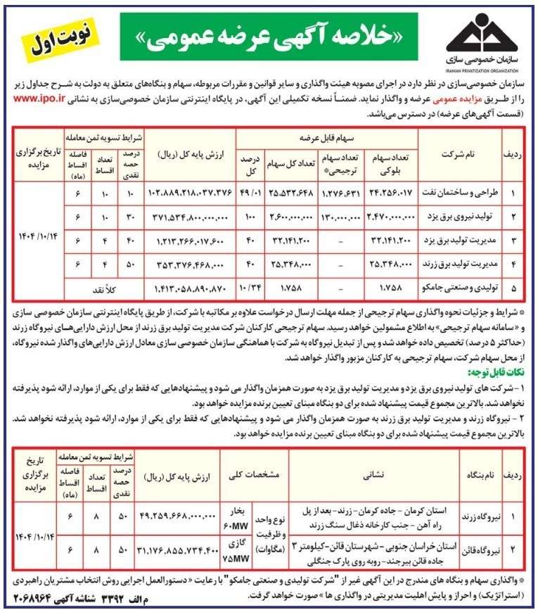 آوای جنوب، سازمان خصوصی سازی در نظر دارد در اجرای مصوبه هیات واگذاری و سایر قوانین و مقررات مربوطه، سهام شرکتهای “طراحی و ساختمان نفت”، “تولید نیروی برق یزد” ،”مدیریت تولید نیروی برق یزد”، “مدیریت تولید نیروی برق زرند”و” تولیدی و صنعتی جامکوگ و بنگاههای “نیروگاه زرندگ و ” نیروگاه قائن” را از طریق مزایده عمومی عرضه و واگذار نماید.
