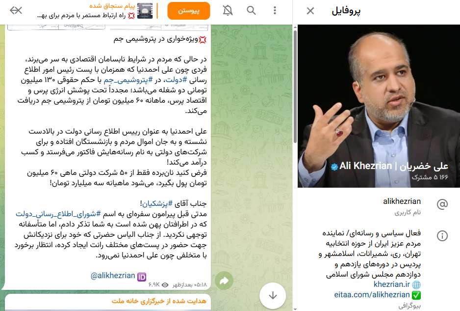 علی خضریان در کانال شخصی خود نوشت: در حالی که مردم در شرایط نابسامان اقتصادی به سر میبرند، فردی چون علی احمدنیا که همزمان با پست رئیس امور اطلاع رسانی دولت، در پتروشیمی جم با حکم حقوقی ۱۳۰ میلیون تومانی دو شغله میباشد؛ مجدداً تحت پوشش انرژی پرس و اقتصاد پرس، ماهانه ۶۰ میلیون تومان