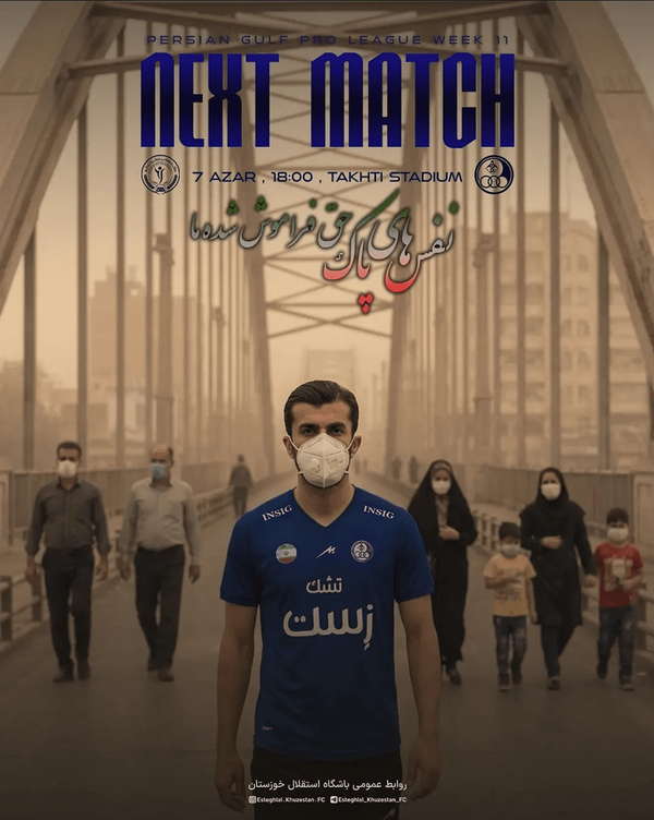 تیم استقلال خوزستان در آستانه دیدار هفته پیشِرو مقابل گلگهر سیرجان، از پوستر رسمی این مسابقه رونمایی کرد؛ پوستری که با شعار «نفسهای پاک، حق فراموششدهها» بازتاب گستردهای در فضای مجازی داشت و بهنوعی یادآور وضعیت نگرانکننده آلودگی هوا در اهواز و سایر شهرهای خوزستان است.